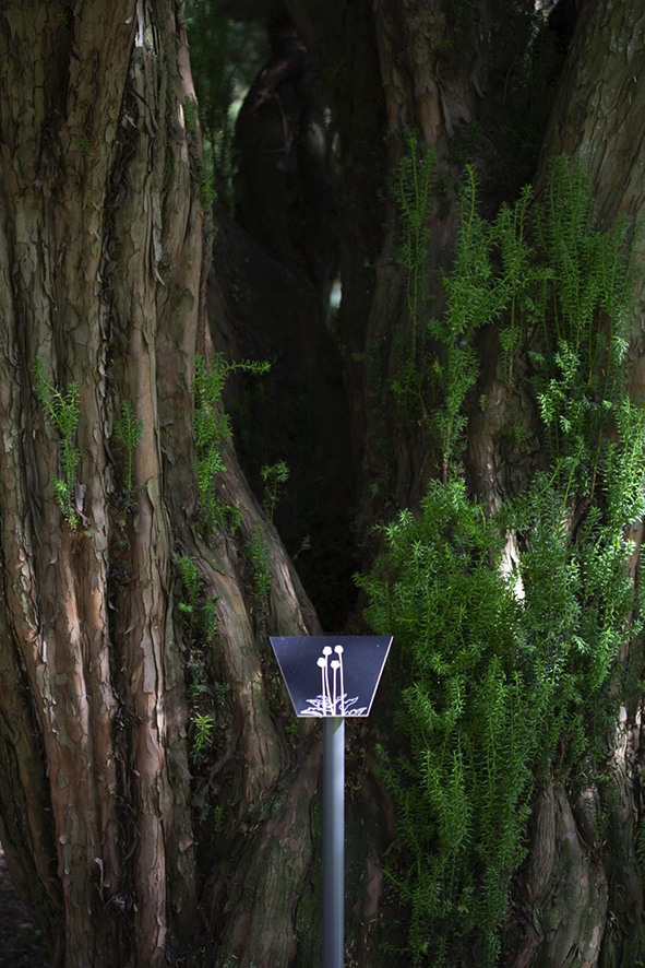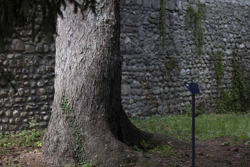 The placement of the signs in this site was guided by monumental trees. Trees, like bees and angels, communicate between the Earth and the Heaven. Thus it was a remarkable coincidence fto ind many of these imposing trees injured and fallen as a consequence of the storm in the planned day of the opening.